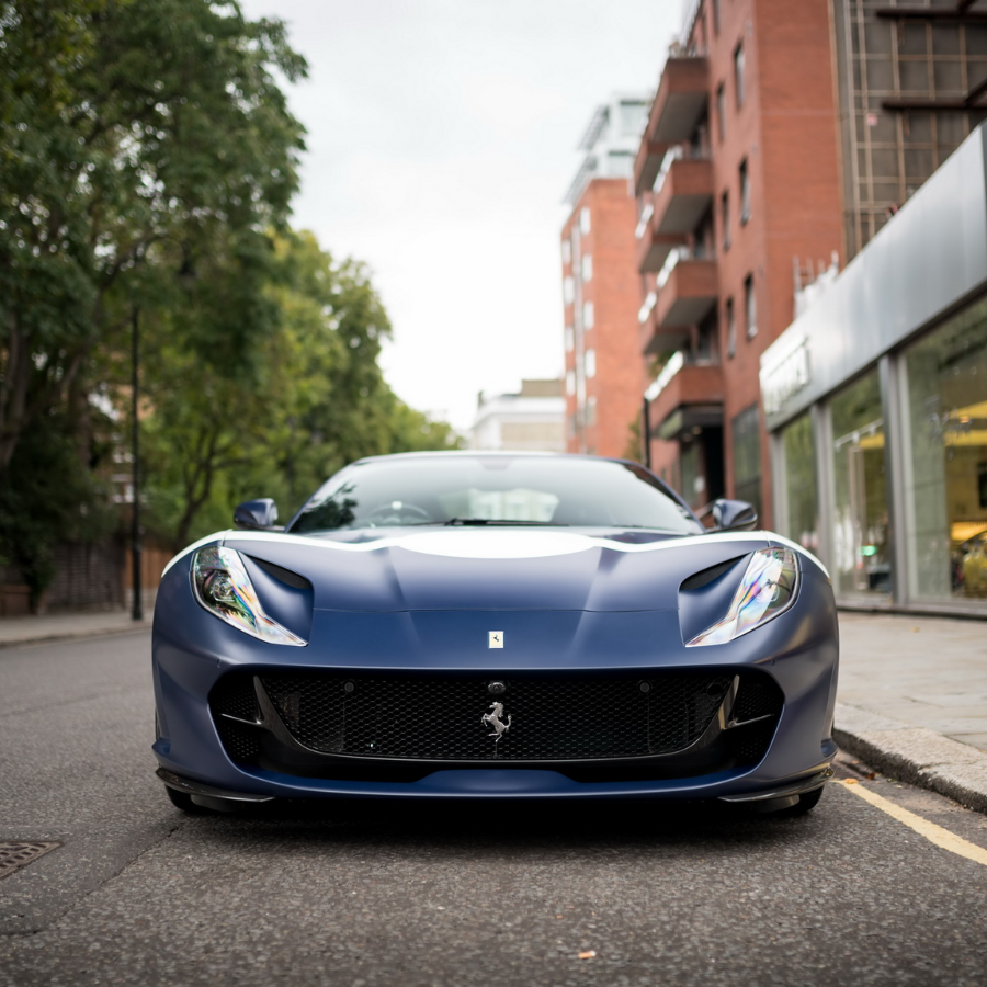 Ferrari 812 Superfast Tailor Made — a Stirling Moss tribute in bespoke Blu Scozia Opaco with iconic racing details.